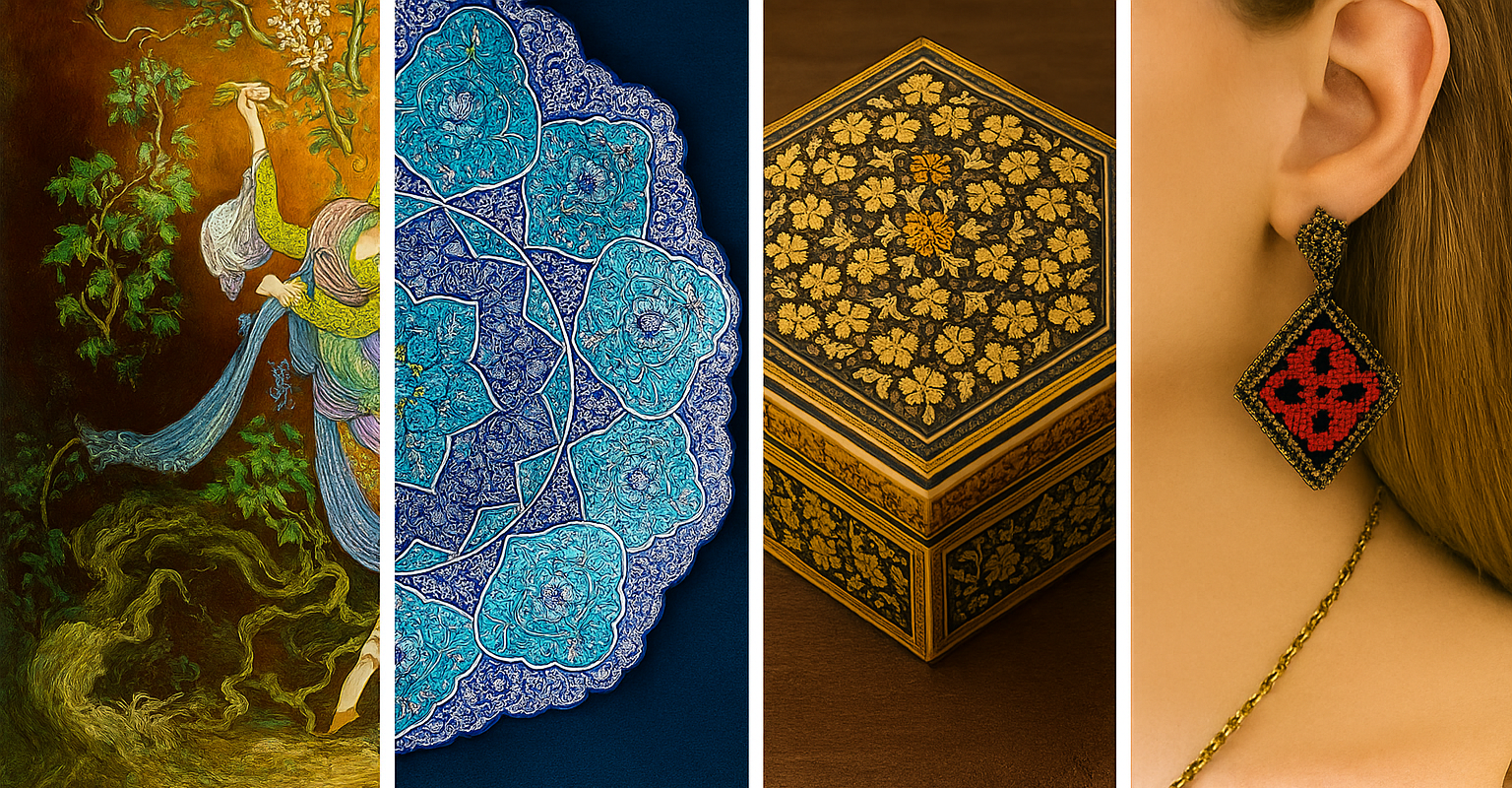 Persian handicraft jewelry is a stunning fusion of artistic heritage, cultural symbolism, and meticulous craftsmanship. Rooted in centuries-old traditions, these pieces are often handcrafted using techniques like Khatam inlay, Minakari enameling, filigree metalwork, and textile embroidery. Artisans combine materials such as brass, silver, wood, enamel, and colorful stones to create earrings, necklaces, and pendants that reflect Iran's diverse regional styles. Each piece tells a story—whether it's inspired by ancient Persian motifs, floral patterns, or tribal identity—and carries the warmth of human touch. Persian handicraft jewelry is not only an accessory but also a testament to the country's enduring artistic soul, cherished by those who value cultural authenticity and timeless beauty.